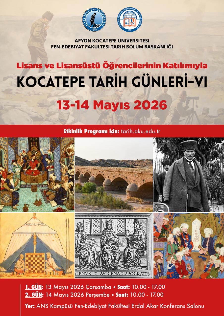 2021 yılından itibaren düzenli olarak gerçekleştirilen Kocatepe Tarih Günlerinin altıncısı Lisans ve Lisansüstü öğrencilerimizin katılımı ile 13-14 Mayıs 2026 tarihlerinde Afyon Kocatepe Üniversitesi Fen-Edebiyat Fakültesi Erdal Akar Konferans Salonunda gerçekleştirilecektir.
